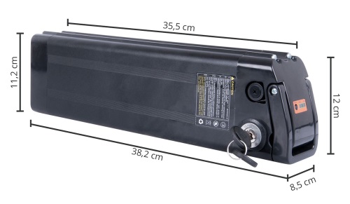 Die Batterie mit der Anbringung hiter der Sattelstange, die Kapazität 10 Ah, die Spannung 37 V, die Technologie Phylion. mehr