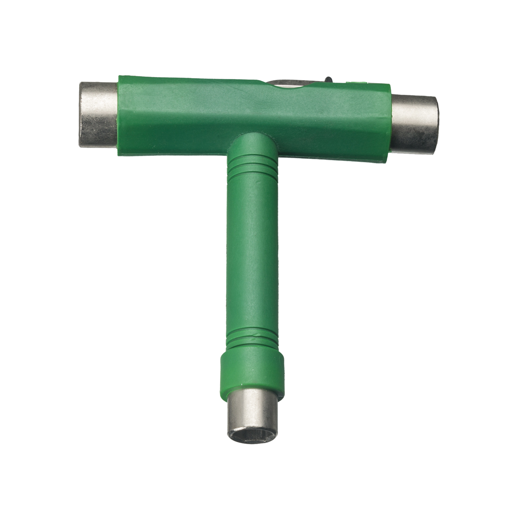 Der T-Schlüssel für das Skateboard enthält alles Notwendige für die Montage und Einstellung Ihres Brettes (es sei das Skateboard, Penny Board oder Longboard). Er ist in der Kombination des gehärteten Kunststoffs und Stahls gefertigt. Dank den drei Abmessungen der Aufsteckschlüssel (10, 13 und 14 mm) dient er für das Festziehen der Schrauben von den Trucks, der Muttern bei den Rädern bzw. der Mutter an dem King Pin oder direkt für den Austausch der ganzen Komponenten. Ein Bestandteil des Schlüssels ist der abnehmbare Schraubenzieher in der L-Form mit dem Imbus- und Kreuzschlitzendstück. Das kann im Inneren der Konstruktion aufbewahrt werden. Alle scharfen Kanten sind an dem Schlüssel sorgfältig gedeckt, wegen der möglichst hohen Sicherheit bei der Handhabung. Der T-Schlüssel ist so der unentbehrliche Bestandteil der Ausstattung jedes Skaters.