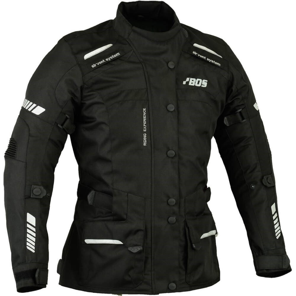 Die BOS 5787 Damen Touring Motorradjacke ist eine hochwertige Jacke aus Textilwerkstoff, entworfen auf dem Drei-Schicht-Prinzip. Diese Jacke verfügt nämlich über abnehmbares Thermofutter, sowie über eine Klimamembrane, die für die Wasser- und Winddichtheit, sowie jedoch für die Atmungsaktivität der Jacke vom innen nach außen sorgt. Die Jacke verfügt über eine Vielzahl von einstellbaren Lüftungsflächen, die ein durchgearbeitetes Lüftungssystem bilden, und die Jacke kann daher problemlos auch im Sommer bei höheren Temperaturen genutzt werden. Mit 4 Außentaschen und 3 Innentaschen bietet die Jacke viel Aufbewahrungsraum für erforderliche Ausrüstung eines Motorradfahrers oder Ausweise. Für größere Sachen oder Dokumente dient noch besser die Tasche auf dem Rücken. Die ganze Funktionalität der Jacke wird durch wasserdichte Nähte ergänzt.