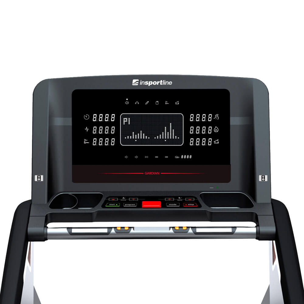 Laufband inSPORTline Gardian G6 verfügt über eine umfassende Programmausstattung - 24 voreingestellte Programme, 2 Benutzerprogramme und HRC Programm auf der Basis von festgelegter Pulsfrequenz, die über Sensoren in den Handläufen erfasst wird, und Puls im Bereich zwischen 50 bis 140 BPM (Pulsschläge pro Minute) misst. Sämtliche Informationen werden auf einem großem 18,5" Display angezeigt. Insbesondere die Zeit, Geschwindigkeit, Neigung, Entfernung, Pulsfrequenz und verbrannte Kalorien. Unterhalb dieses Displays befinden sich alle Bedienungstasten, einschließlich schneller Geschwindigkeits- und Neigungseinstellung. Gardian G6 verfügt auch über USB-Port, MP3 Player mit Lautsprechern, Audio-Eingang für Kopfhörer und einen Slot für Speicherkarten. Interessant ist auch das Pedometer, platziert unterhalb des Displays, das die Anzahl der Schritte anzeigt. Unabhängig von der Einstellung wird auf dem Display die Funktion Matrix angezeigt, die eine 400 Meter lange Strecke anzeigt. Dank diesen Eigenschaften ist das Laufband inSPORTline Gardian G6 eine tolle Wahl für anspruchsvolle Läufer, die bequem zu Hause laufen wollen.