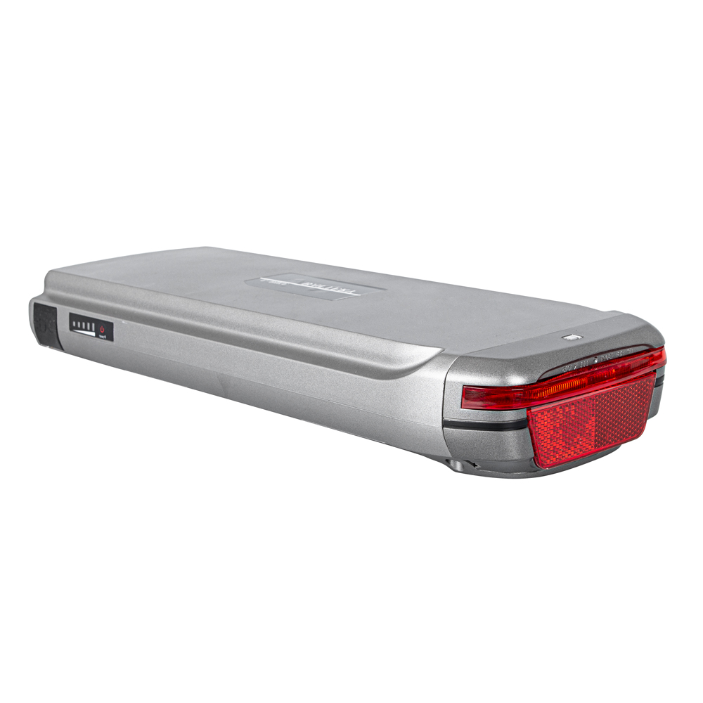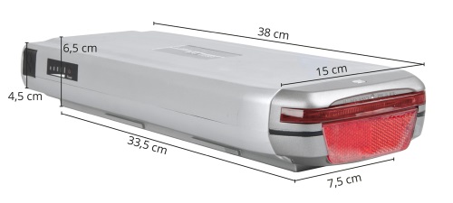 Unter Gepäckträger verstaut, 36 V, 14,5 Ah Kapazität, Li-Ion-Technologie. mehr