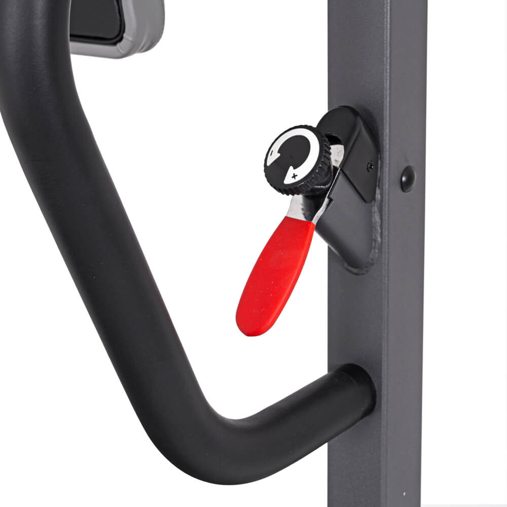 Auf der gegenüberliegenden Seite des Laufbands befindet sich eine horizontale Stange mit zwei Arten von Griffen zur Verstärkung des Rückens und der Schultern . Um die Sache noch schlimmer zu machen, können Sie die einzelnen Spalten der horizontalen Leiste auf 5 verschiedene Höhen im Bereich von 195 bis 215 cm einstellen. Daher ist die Körpergröße des Benutzers kein Problem!