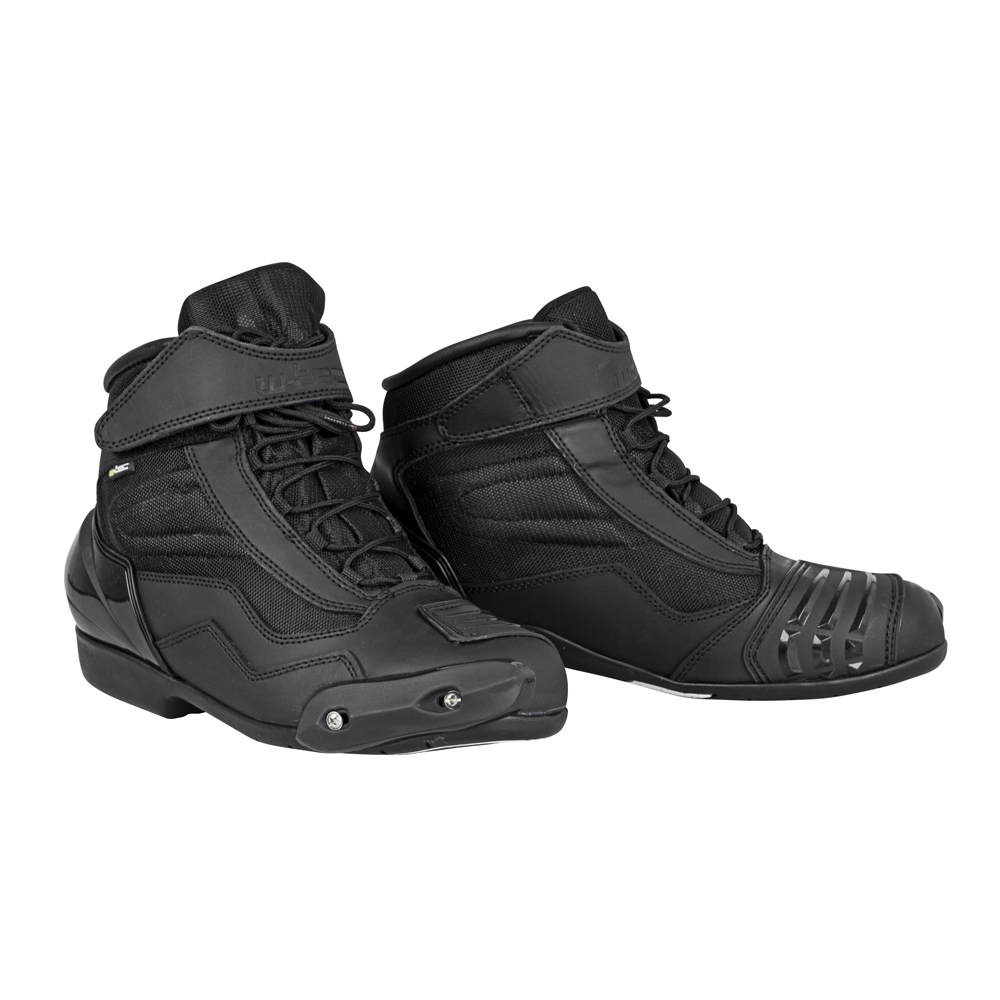 W-TEC Bolter Motorradstiefel sind Knöchelschuhe aus einer Kombination von Leder und Nylon für Motorräder oder Motorroller. Auf den ersten Blick besticht es durch seine schlanke sportliche Form und den unverwechselbaren, robusten Fersenschutz. Es gibt sogar abnehmbare Schieberegler, so dass Sie die Kurven und Kehren beliebig gestalten können. Natürlich gibt es auch andere verstärkte Elemente an anderen strategischen Teilen des Schuhs.