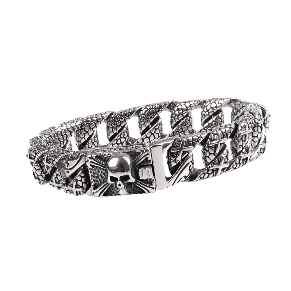 Gefährlich aussehendes Stahlarmband mit beeindruckendem Relief des Schädels und effektiver Dekoration auf der gesamten Oberfläche! mehr