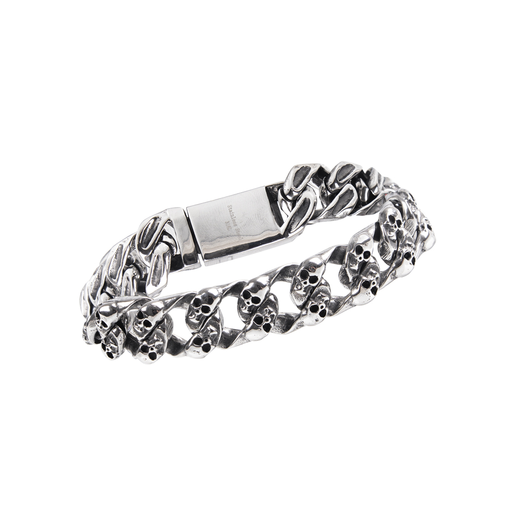 Eine feinere Stahlkette aus ineinander verschlungenen Schädeln als stilvolles Accessoire für alle harten Jungs! Die glänzende Oberfläche bildet einen schönen Kontrast zur Patina! mehr