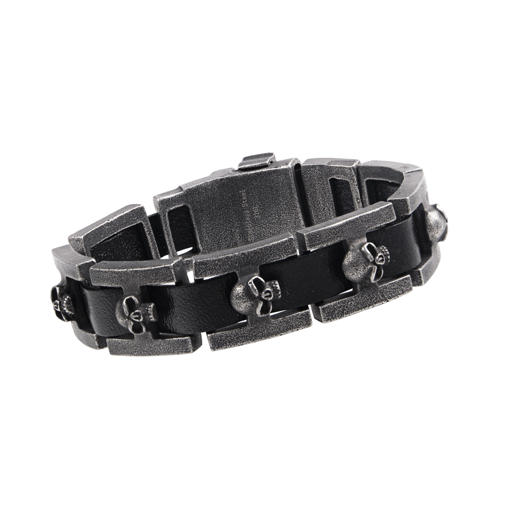 Massiveres Armband aus Leder und patiniertem Stahl für anspruchsvolle! Einzelne Artikel sind mit detailliert geformten Schädeln verziert! mehr