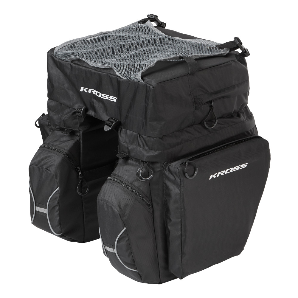 Die Kross Roamer Triple Rear Bag ist eine erstklassige Triple Carrier Bag aus strapazierfähigem Polyestermaterial. Der innere Teil der Fächer ist verstärkt, so dass die gesamte Struktur ihre Form gut beibehält. An den Seiten finden Sie auch kleinere Taschen für verschiedene Kleinigkeiten. Der obere Teil der Tasche ist mit einem Netz ausgestattet, an dem Sie größeres Gepäck anbringen können. Die Befestigung am Träger selbst ist einfach und Sie benötigen kein zusätzliches Werkzeug. Sie packen alles, was Sie unterwegs brauchen, in Ihre Tasche - eine Brieftasche, Schlüssel, ein Handy, Kleidung und Snacks.