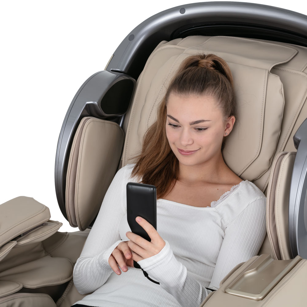 DasHören von Musik ist eine weitere interaktive Therapieform, um innere Ruhe und Wohlbefinden zu erlangen. Die Kombination aus Musik und Massage gibt Ihnen einen Schub an neuer, positiver Energie. Sie können den Sessel mit Ihrem Mobiltelefon oder einem anderen intelligenten Gerät verbinden und Ihre Lieblingsmusik einschalten. Außerdem gibt es einen USB-Ladesteckplatz, damit Ihrem Handy nie der Strom ausgeht.