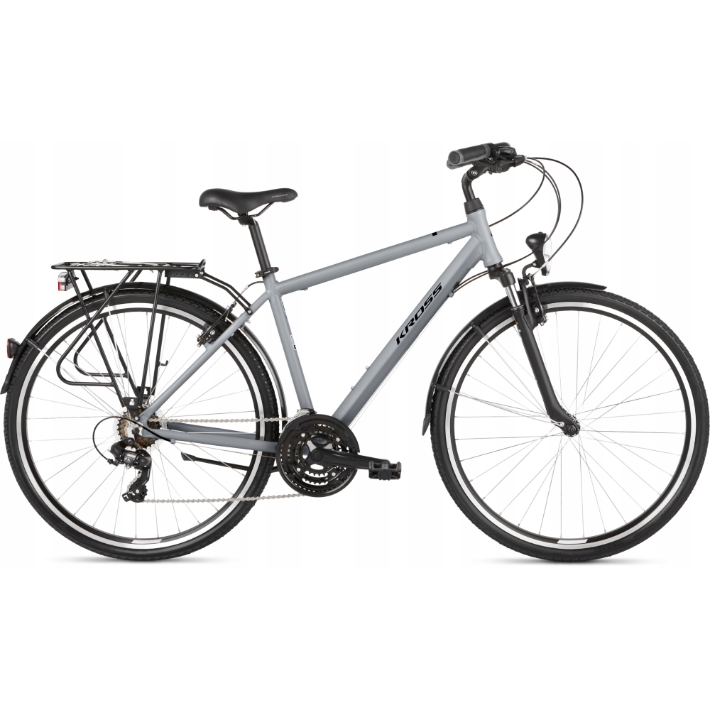 Das Herren-Trekkingrad Kross Trans 1.0 28“ Gen 002 ist ein hochwertiges Fahrrad mit leichtem Aluminiumrahmen, der für eine aufrechte Sitzposition sorgt und für Komfort während der Fahrt sorgt. Die Federgabel mit 30 mm Federweg , 24-Gang- Shimano-Kettenschaltung und hochwertigen V-Brakes machen es sowohl für befestigte Wege als auch für unbefestigte Wege geeignet.