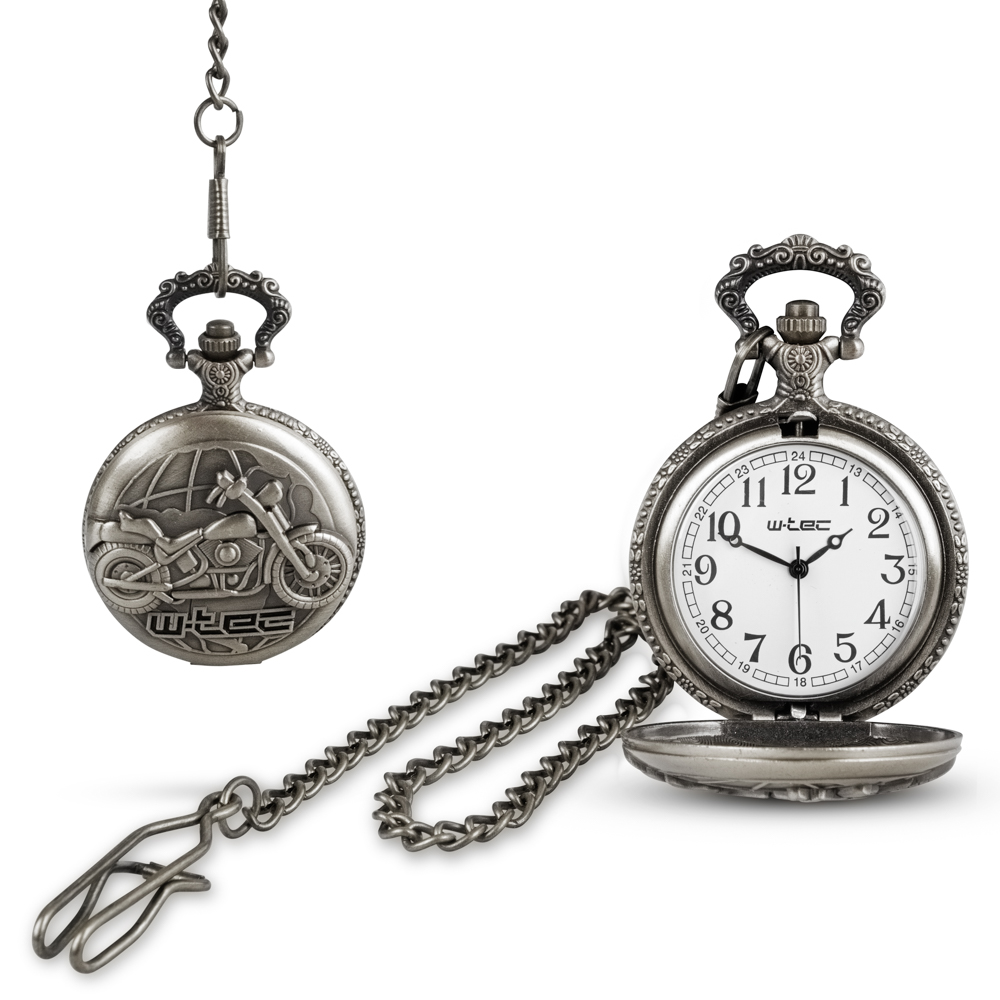 Die W-TEC Reverend Taschenuhr ist eine elegante Uhr für alle die Wert auf einen eigenen unverkennbaren Stil legen. Die Uhr im Vintage-Design wird durch das dreidimensionale Biker-Motiv auf der oberen Abdeckung hervorgehoben. Auf der anderen Seite befindet sich ein mit Reliefs verziertes Gehäuse. Die Uhr ist in einem Stahlgehäuse untergebracht und batteriebetrieben. Die Krone bei 12 Uhr dient zum Einstellen der Uhrzeit. Holen Sie sich dieses dezente Retro-Accessoire, das Sie zu einem echten Kavalier macht.