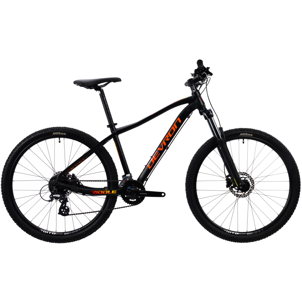 Das Devron Riddle H1.7 27.5" Mountainbike ist ein hochwertiges Mountainbike mit tollen Komponenten. Der Aluminiumrahmen mit geschwungener Geometrie sorgt nicht nur für einen auffälligen Look, sondern auch für hervorragende Fahreigenschaften auf und abseits der Straße. Die Suntour-Federgabel verfügt über einen Federweg von 130 mm und meistert auch das Gelände ohne Probleme. Für eine ruhige Fahrt sorgen die Shimano-Schaltung mit 24 Gängen und die hochwertigen Mitas-Reifen. Noch schnellere Fahrten werden durch hydraulische Scheibenbremsen sicher gebändigt. Das Devron Riddle H1.7 Mountainbike wird jeden Radsportbegeisterten begeistern, sowohl im Design als auch in der Ausstattung.