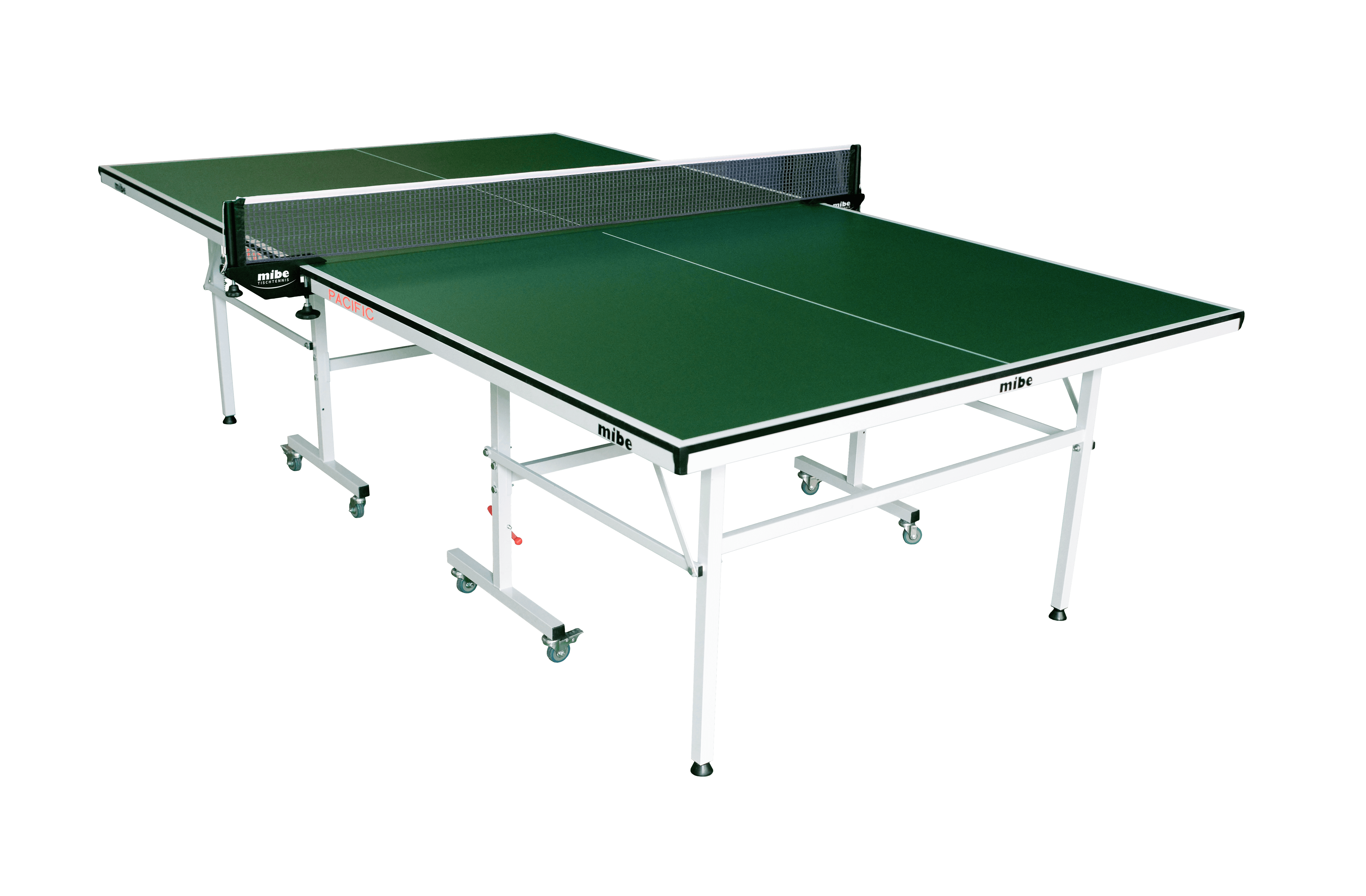 Die MIBE PACIFIC Tischtennisplatte ist ein hochwertiger und äußerst stabiler Tisch mit tollen Spieleigenschaften der deutschen Traditionsmarke MIBE. Er hat einen einfachen Klappmechanismus und benötigt so wenig Platz zum Abstellen. Der Rahmen ist solide und exakt gearbeitet. Die massive Platte besteht aus aus modernem 15mm starken MDF Material (medium density fibreboard). Dank der Möglichkeit des einfachen Zusammenklappens und dem leichten Transport auf acht Rädern ist der MIBE PACIFIC TT-Tisch ideal für Freizeitzentren, Schulen, Jugend-Klubs und überall dort, wo man den Tisch schnell verstauen muss. Die sehr hochwertigen Tischeigenschaften eignen sich für alle alle Spielerinnen und Spieler - auch den etwas Anspruchsvolleren. Das Hochklappen von einer Tischhälfte in den rechten Winkel ermöglicht das Einzel-Training und macht den Tisch noch interessanter. Das System von acht fixen Rädern mit einem hochwertigen Bremsmechanismus sorgt für eine perfekte Stabilität beim Spiel.