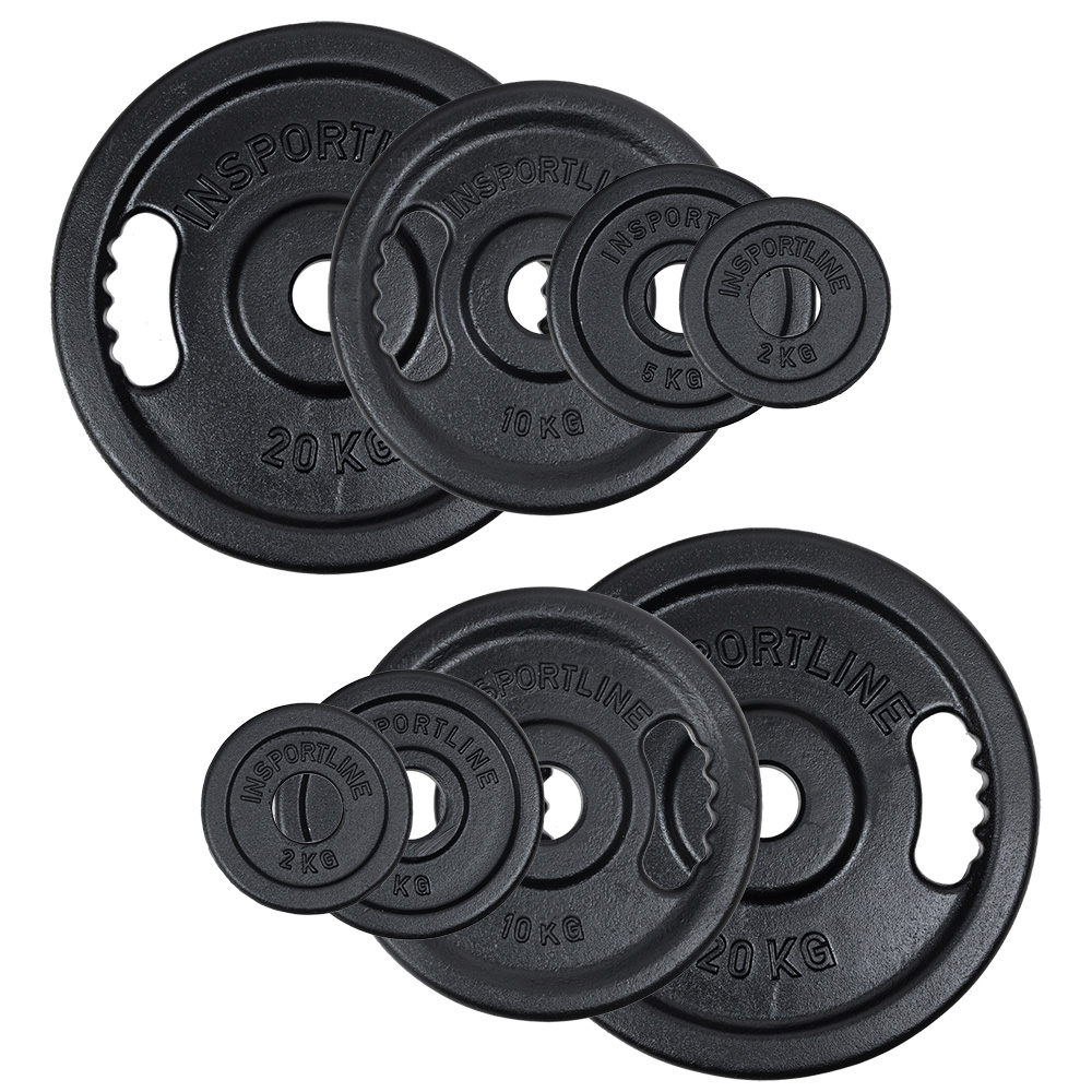 Preisgünstiges Set aus hochwertigen Gusseisen-Scheiben für das Krafttraining, ideal für Heim- und professionelle Fitnessstudios. Dank der ergonomischen Griffe können die Gewichte auch als separate Hanteln verwendet werden. mehr