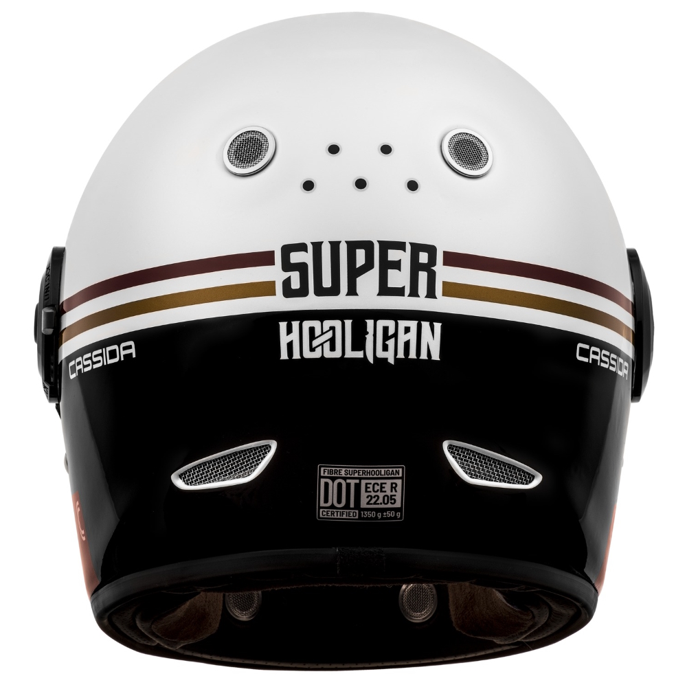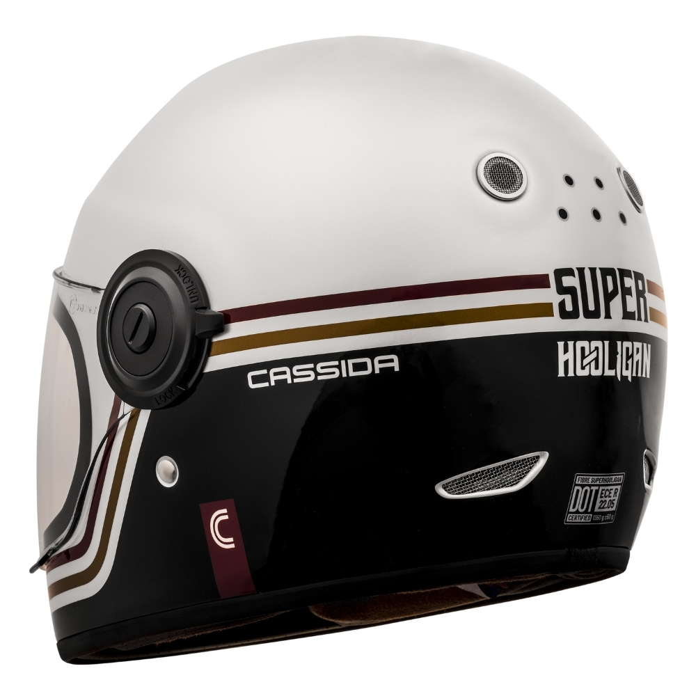 Der Cassida Fiber-Motorradhelm ist ein Integralhelm mit einer Glasfaserschale, den Sicherheitsstandards moderner Helme und einem Design, das sich an Benutzer von Vintage-, „Neo-Retro“- und modernen klassischen Motorrädern richtet. Besonders erfreulich ist der große Blickwinkel, der fast mit offenen Helmen vergleichbar ist. Auch die Befestigung erfolgt klassisch – mit doppelten DD-Ringen.