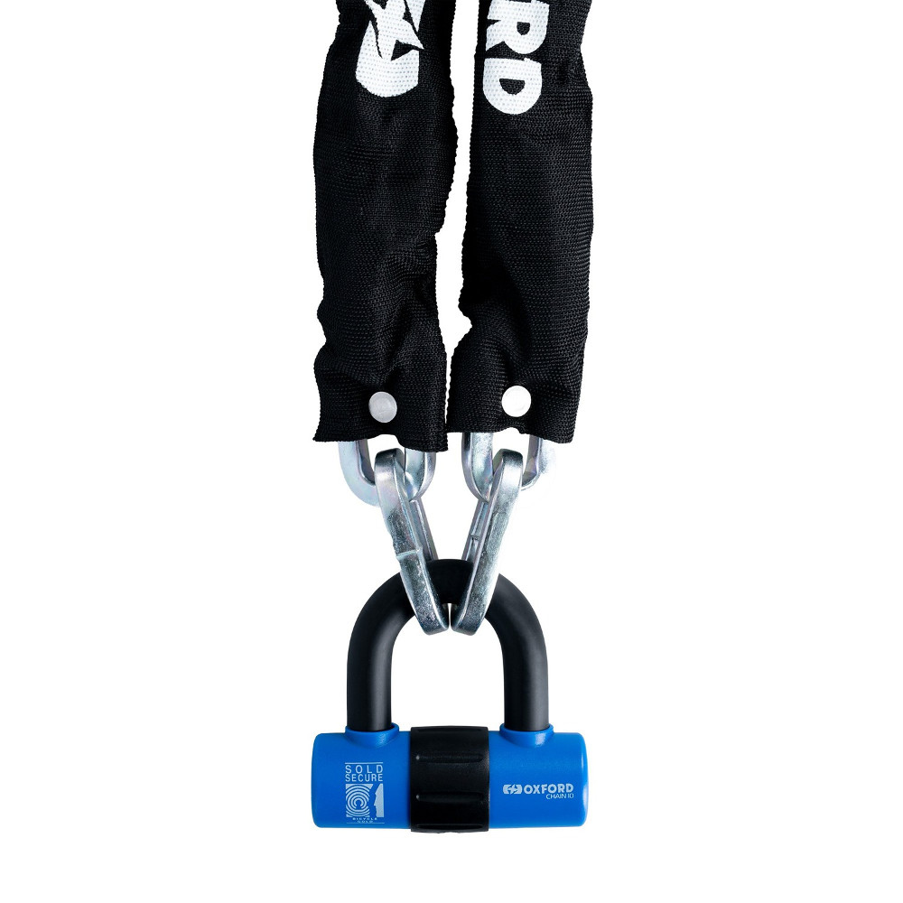Das Oxford Chain10 ist ein Mehrzweck-Kettenschloss mit einer Länge von 140 cm, ideal für die Sicherung von Motorrädern oder im Freien. Es wird mit einer 10mm gehärteten Stahlkette geliefert, die eine schützende Stoffhülle hat, um Kratzer im Lack zu vermeiden. Sie finden auch 3 Schlüssel in der Packung zusammen mit dem Schloss.