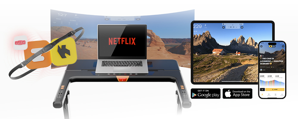 Über Bluetooth ist das inSPORTline Laufband mit den mobilen Apps Kinomap oder Zwift verbunden, mit denen Sie langfristige Trends Ihres Trainings verfolgen, virtuelle Rennen mit anderen Nutzern austragen oder voreingestellte Strecken mit Videounterstützung direkt auf Ihrem Smartphone oder Tablet ablaufen können.