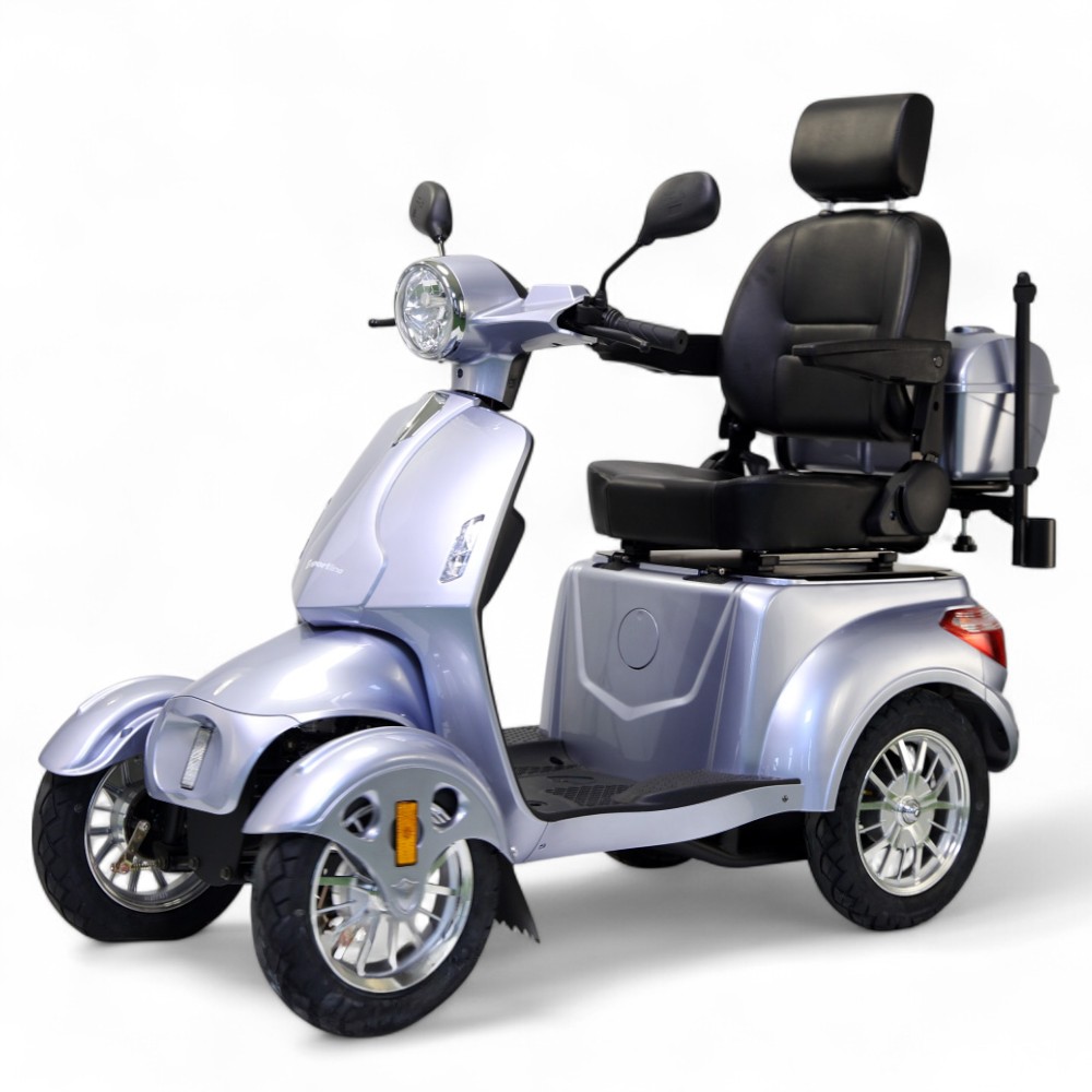 Da es sich um einen elektrisch betriebenen Scooter handelt, ist der Betrieb der Maschine leise und umweltfreundlich. Außerdem kann man ihn ohne Führerschein fahren! Der Sitz ist bequem, und dank der verstellbaren Armlehnen können Sie auch dann bequem sitzen, wenn Sie in Ihrer Bewegung eingeschränkt sind. Im Fond finden Sie 2 Staufächer, in denen Sie Ihre Einkäufe oder kleineres Gepäck bequem verstauen können.