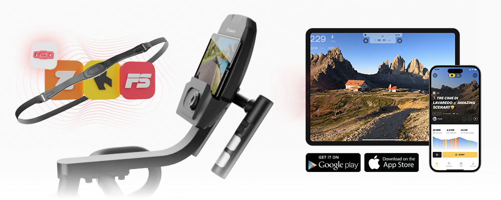 Manchmal muss das Training einfach mehr Spaß machen. Deshalb bietet der inSPORTline ZenRoute 250 neben den üblichen Voreinstellungen und Benutzerprogrammen auch die Möglichkeit, sich mit den Apps Zwift oder Kinomap zu verbinden. Auf diese Weise kann ein gewöhnliches Training leicht zu einem Rennen mit Menschen aus verschiedenen Kontinenten oder zu einer Freizeitfahrt auf den schönsten Strecken der Welt werden.