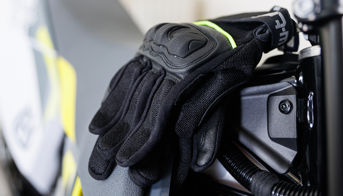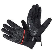 Atmungsaktive Handschuhe mit Carbon-Aramid -Protektoren an den Handgelenken.