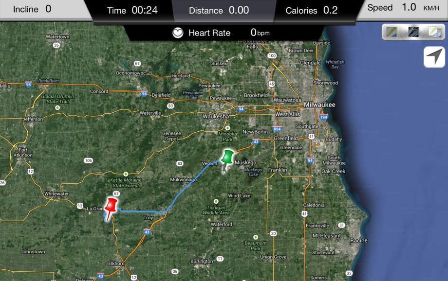 Neben Standardfunktionen, wie Belastungsprofile oder manuelle Programme, können reale Strecken über Google Maps eingestellt werden. Somit können Sie virtuell in Alpen, in Straßen von Paris, über Miami Strände und in anderen Weltmetropolen oder interessanten Orten der Welt laufen. Die Geräte kopieren zugleich das Profil der Strecke, was automatisch durch die Änderung der Belastung beeinflusst ist. Dank dem wird eine höhere Realität erreicht. Während des Trainings kann man zwischen drei Typen von Karten umschalten, zu welchen auch Bilder von Google Street View gehören. Somit können Sie die Welt bequem von zu Hause erkunden und zugleich etwas für Ihren Körper tun.